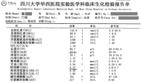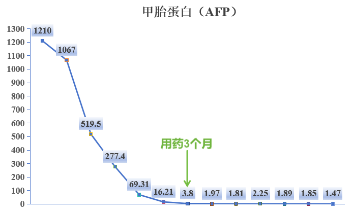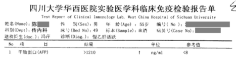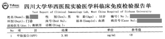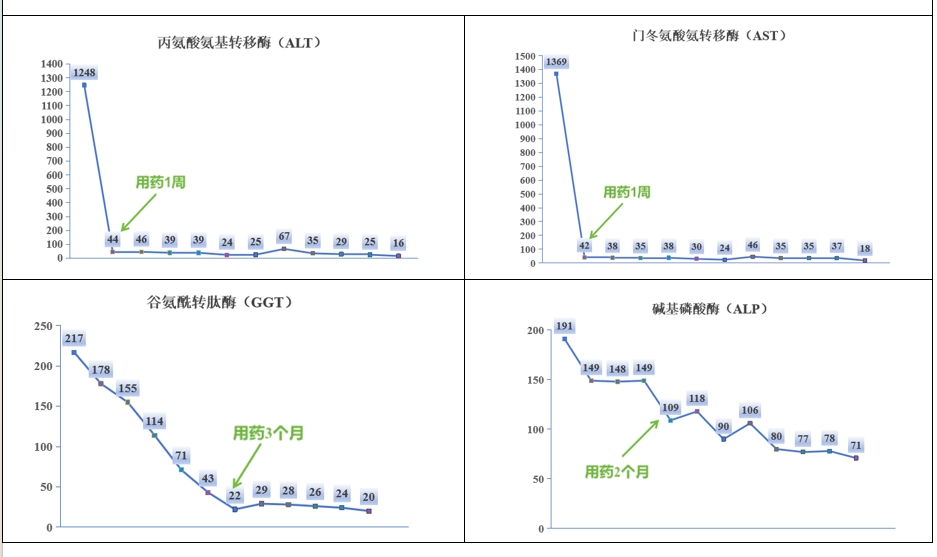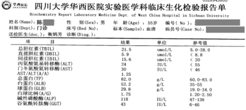 患者用藥前影像學(xué)檢查報(bào)告顯示肝多發(fā)囊腫,甲胎蛋白(AFP)高達(dá)1210ng/ml(大面積肝壞死),醫(yī)院建議必須換肝,而且還不能保證患者是否可以獲得有效治療。 患者未采用手術(shù),隨后5年期間,患者長期使用注射用綠原酸,未使用其他任何治療;5年后改為口服保健食品九樟牌咀嚼片(每年注射1個療程注射用綠原酸)。維持至今,患者各項(xiàng)指標(biāo)均保持正常水平,身體狀況良好,與常人無異。