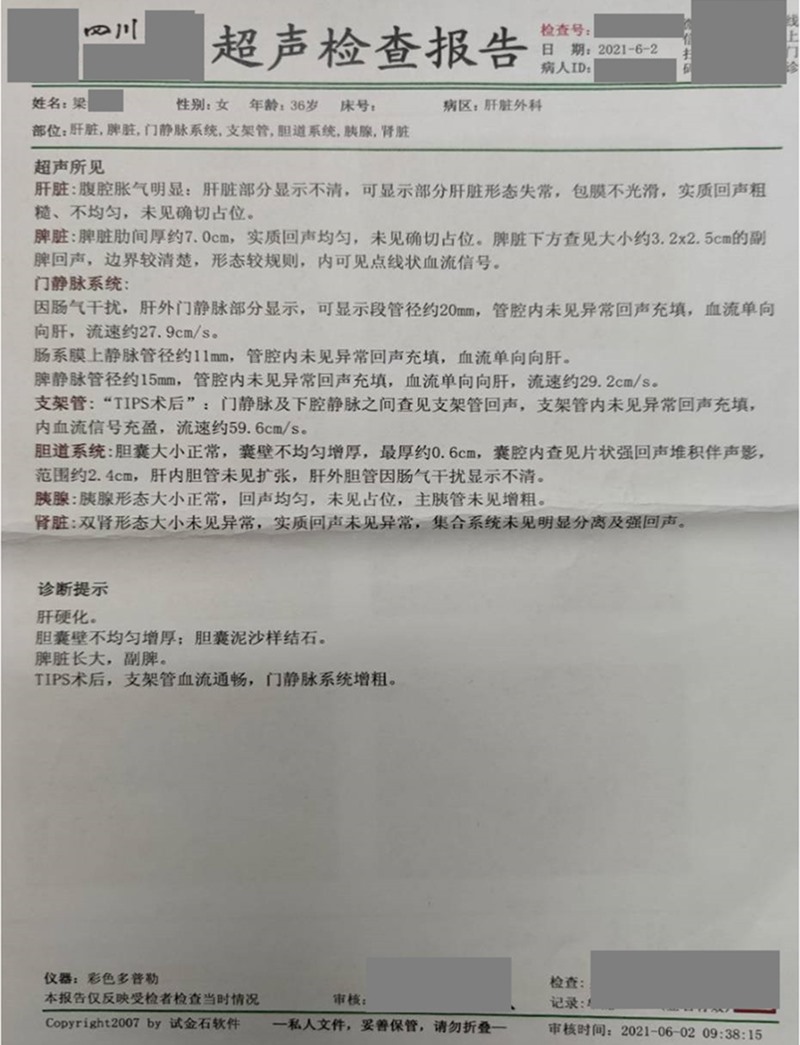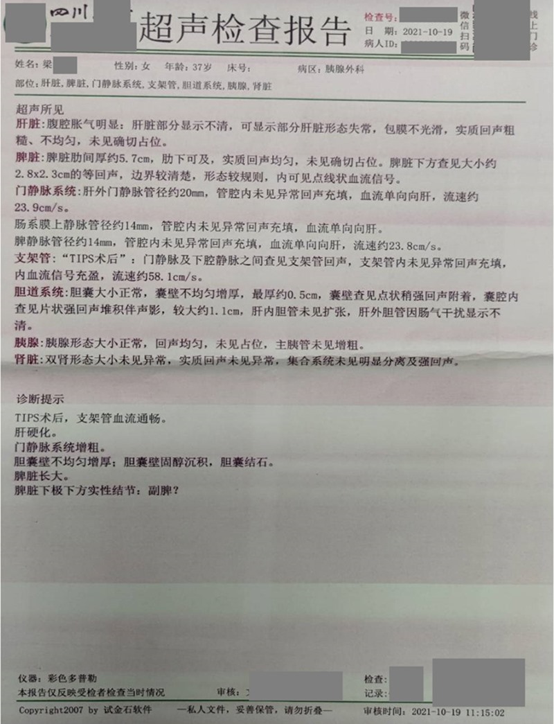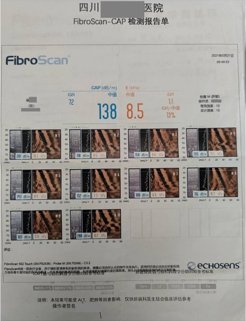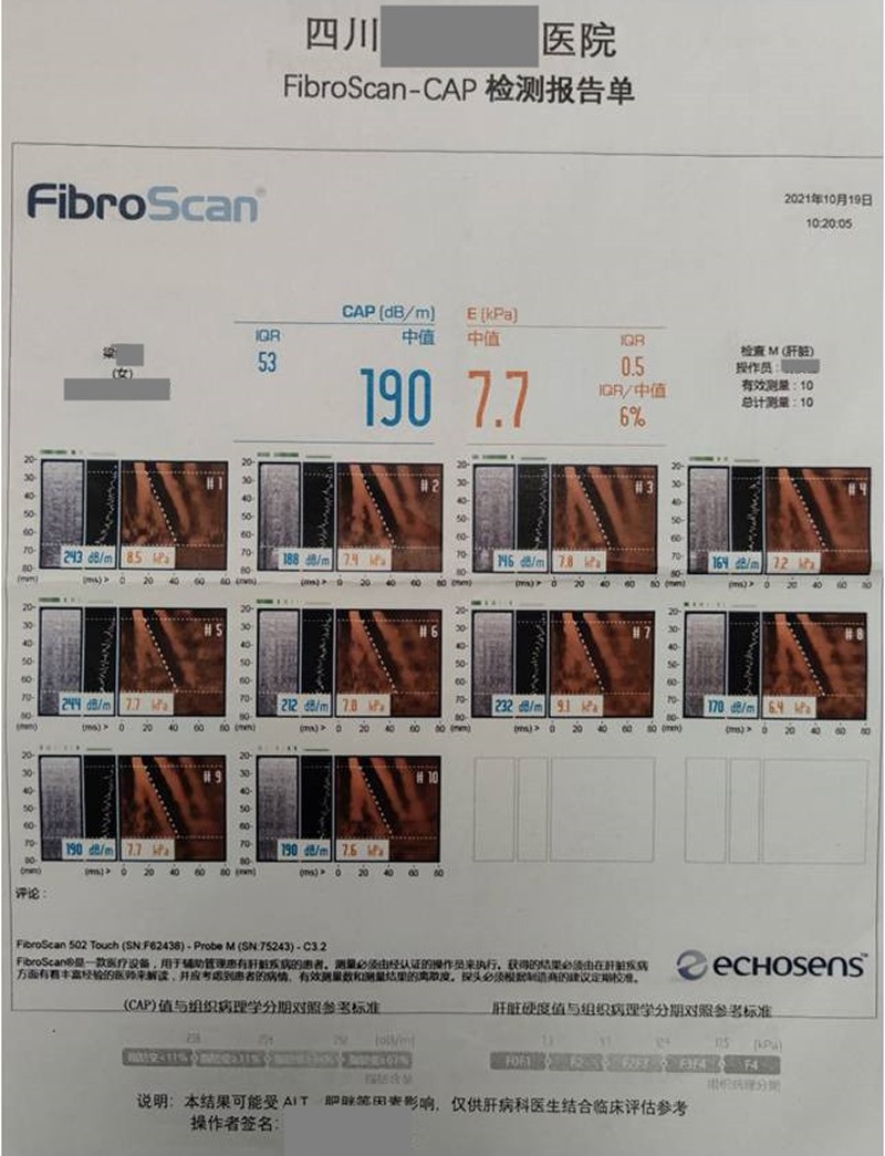 用藥前患者臨床診斷為肝硬化,脾臟腫大。確診肝硬化后的幾年間,患者采取多種治療方式,并調(diào)節(jié)飲食,肝硬度指標(biāo)有逐年好轉(zhuǎn)的趨勢,但硬度仍處于較高數(shù)值。單獨(dú)使用注射用綠原酸1個(gè)月后,肝硬度指標(biāo)好轉(zhuǎn)(8.5→7.7),而且一直沒法解決的脾臟腫大問題,也得到了改善,脾臟厚度變?。?.0cm→5.7cm)?;颊叱掷m(xù)用藥至今,生活質(zhì)量得到較大改善,自我感覺精力變好,睡眠改善,食欲增強(qiáng),手指腫脹也基本消失。
